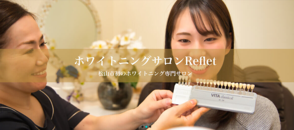 松山市北斎院町にある「ホワイトサロンReflet」は、しばた歯科医院に併設されたホワイトニング専門サロンでオフィスホワイトニング・ホームホワイトニングを取り扱っており、コースプランや回数券もあります。