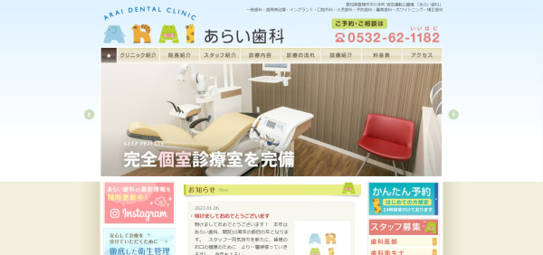 豊橋市平川本町の「あらい歯科」は歯科医師が多数在籍しており、一般歯科をはじめ、インプラント・口腔外科・小児歯科・予防歯科・審美歯科・矯正歯科と多岐に渡る診療に対応されているクリニックです。