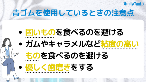・青ゴムを装着している間は、固い食べ物や粘度の高い食べ物を避け、歯磨きの仕方に注意する