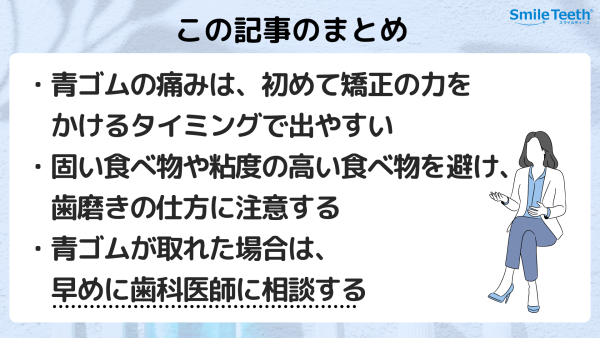 ・青ゴムが取れた場合は、すみやかに口から出して早めに歯科医師に相談する