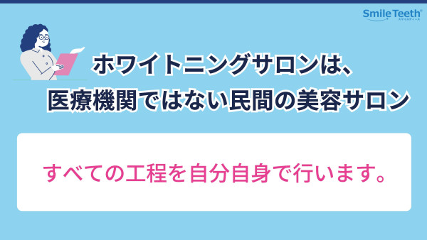 といった特徴があります。基本的には歯科医師や歯科衛生士が在籍しておらず、歯磨きやホワイトニング剤の塗布など